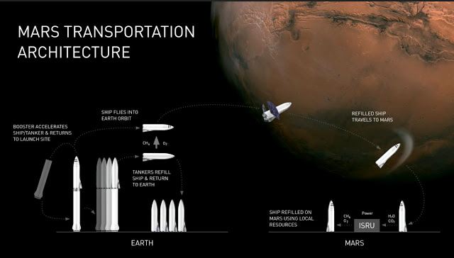 Mars jest oczywistym i głównym celem firmy Elona Muska. Statek po osiągnięciu orbity ma zostać dotankowany przez cztery tankowce, po czym wyruszy w podróż w kierunku Marsa. Tam, po wylądowaniu, będzie konieczne wyprodukowanie paliwa wykorzystując marsjańskie surowce, co pozwoli na start statku z powierzchni Marsa i powrót na Ziemię. Nie będzie potrzebny pierwszy stopień, jako że grawitacja na Marsie jest dużo niższa niż na Ziemi. Elon zaprezentował również symulację wejścia statku w atmosferę Marsa. 99% energii ma zostać zredukowane poprzez hamowanie aerodynamiczne, natomiast samo lądowanie odbywać się będzie przy pomocy silników, tak jak obecnie w przypadku Falcona 9.